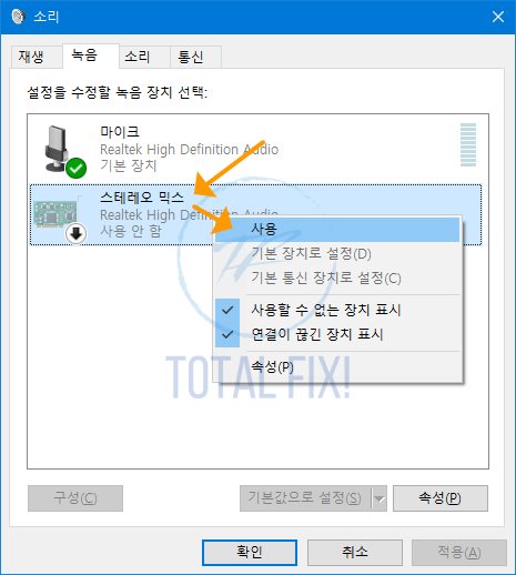 5. 스테레오 믹스에 마우스를 올리고 오른쪽 키를 누른 후 나오는 메뉴에서 사용을 클릭합니다.