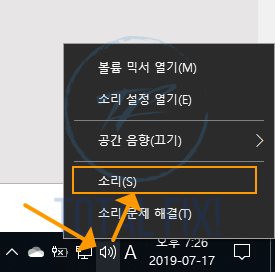 1. 윈도의 오른쪽 아래의 스피커 아이콘 위에 마우스를 올리고 오른쪽 키를 누른 후 나오는 메뉴에서 소리를 클릭 실행합니다.