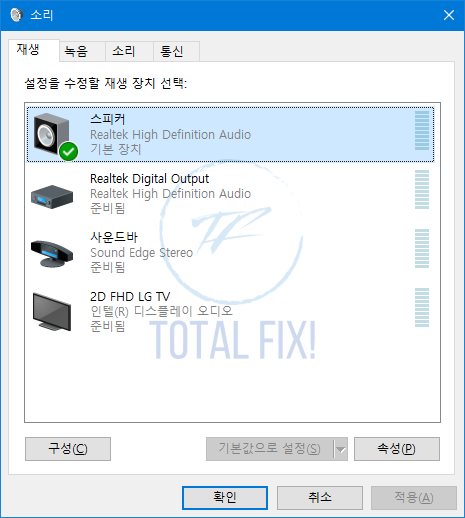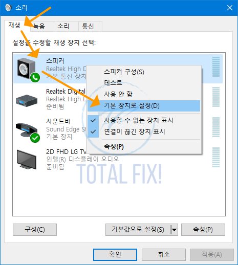 2. 재생 탭에서 스피커에 마우스를 올리고 오른쪽 키를 누른 후 나오는 메뉴에서 기본 장치로 설정을 클릭합니다.