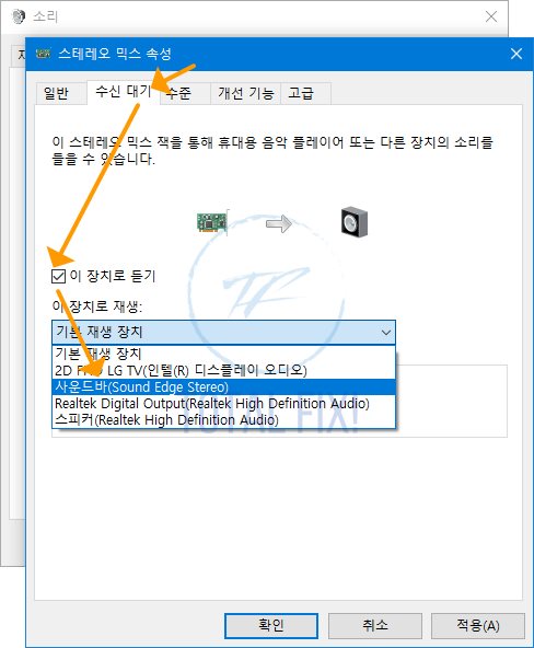 8. 스테레오 믹스 속성 창에서 수신 대기 탭으로 이동 후 이 장치로 듣기에 체크하고 스피커와 동시에 듣기를 원하는 장치를 선택 후 적용합니다.
