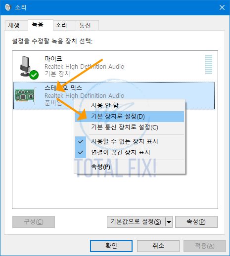 6. 다시 스테레오 믹스에 마우스를 올리고 오른쪽 키를 누른 후 나오는 메뉴에서 기본 장치로 설정을 클릭합니다.