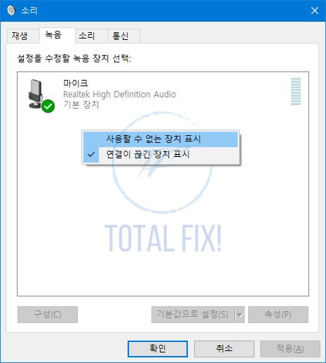4. 이제 녹음 탭으로 이동 후 상자 안의 빈 곳에 마우스를 놓고 오른쪽 키를 누른 후 나오는 메뉴에서 사용할 수 없는 장치 표시를 클릭 체크합니다.