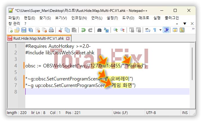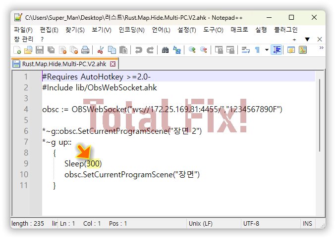 그리고 *~g 라인에 맵 오버레이 장면 이름을 *~g up 라인에 방송화면 장면 이름을 자신의 설정대로 변경하고 저장하고 메모장을 닫습니다.