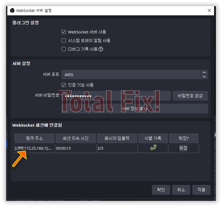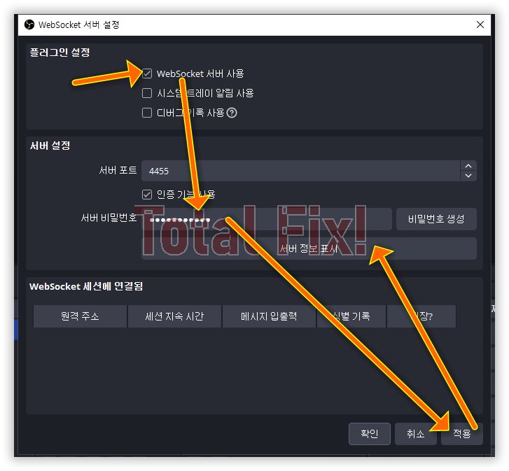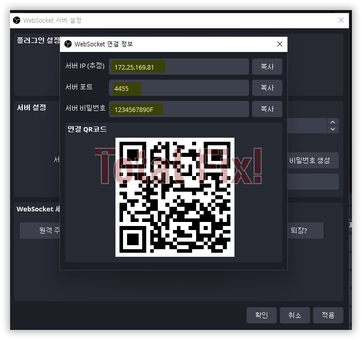 플러그인 설정에서 Websocket 서버 사용에 체크 후 서버 비밀번호를 설정하고 적용한 후 서버 정보 표시를 클릭 합니다.