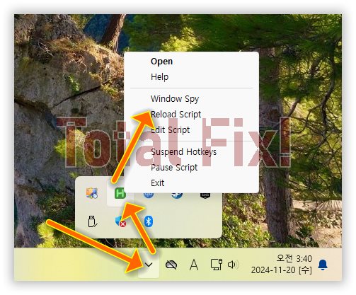 만일 이과정을 거쳤는데도 작동이 되지 않으면 AutoHotKey를 종료후 소스 파일을 더블 클릭 하여 다시 실행 합니다.