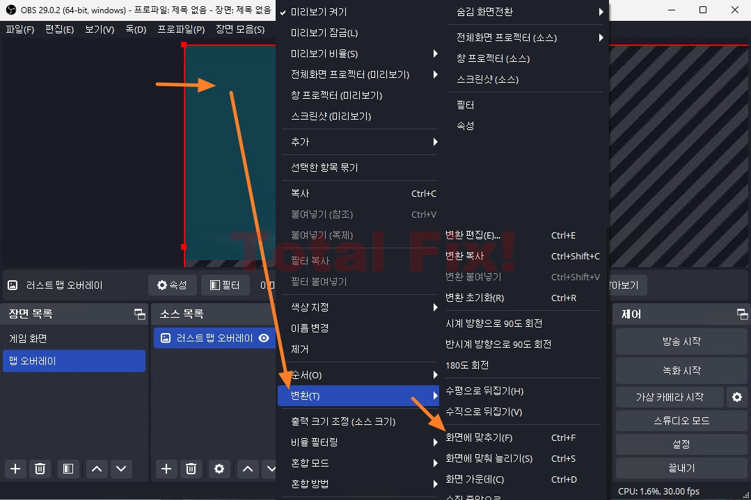 이미지나 미디어 소스가 장면 화면에 맞지 않을시 이미지나 미디어 소스 위에 마우스를 올리고 우측 클릭후 변환 > 화면에 맞추기를 실행 하여 화면에 맞춥니다.