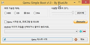 Qemu Simple Boot v1.3 Portable 입니다. Qemu 라는 가상솔루션 프로그램을 기반으로 부팅 테스트를 목적으로 만든 프로그램 입니다. 최대 지원 메모리가 1GB가 한계입니다. USB를 테스트 하기 위해서는 HDD를 선택 합니다. 부트 테스트를 진행할 매체 종류를 먼저 선택 합니다. USB 테스트의 경우 HDD를 선택 합니다. 다음으로 메모리 크기를 선택 합니다. 가능하면 최대치인 1024를 선택 합니다. 다음으로 실제 테스트할 매체를 선택 합니다. 모든 선택이 끝났다면 테스트 시작을 눌러 테스트를 진행 합니다. 올바르게 부팅이 진행 된다면 아래 처럼 부팅이 진행돼는 과정이 보여 질 것입니다. 도중에 에러가 난다면 메모리의 제약으로 인하여 에러가 나는 것이니 실제 설치 가능하다고 생각..